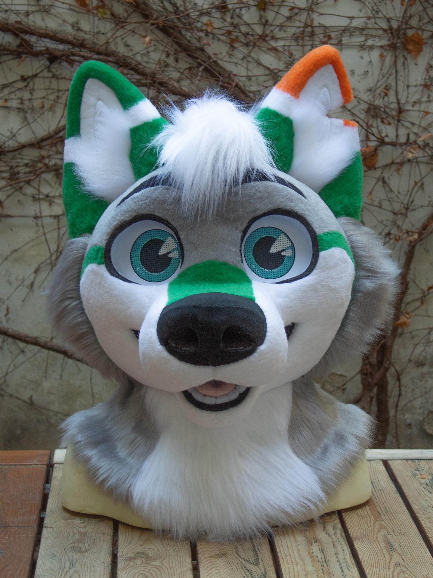 Head, stuffed handpaws, armsleeves, outdoor or indoor feetpaws and a tail